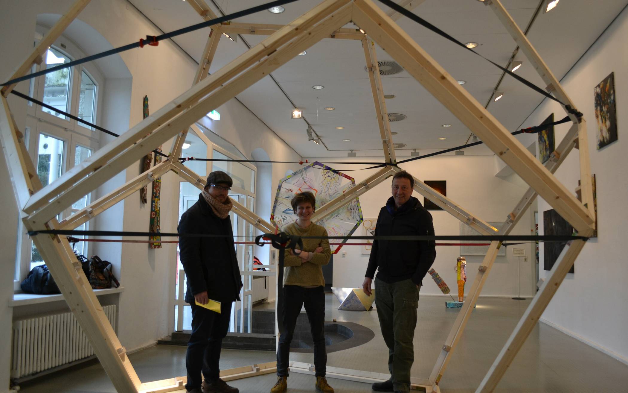 Die Geschwister Mascha Malzeva und Kiril Maltsev werden bei der Eröffnung am morgigen Sonntag um 11.30 Uhr einiges zu erzählen haben. Auch darf man gespannt sein auf die Begrüßung durch Klaus Richter: Der Kurator der städtischen Galerie hat die gesamte Planung und Kuratierung in die Hände der Künstlergruppe gelegt. Und so feilten Till Bödeker, Alwina Heinz, Kiril Maltsev, Mascha Malzeva, Gisa Rosa, Johannes Schwelm, Robert Wilmers und Tine Wirz rund ein Jahr lang am Konzept, sie haben beobachtet, studiert, diskutiert, experimentiert, imitiert, abstrahiert und etwas Neues kreiert. Die Ergebnisse sind vielfältig und beeindruckend: Im Eingangsbereich wird der Besucher von einem rund 3,40 Meter hohen Dodekaeder (ein Körper mit zwölf Flächen) empfangen, geschaffen vom Architekten und Tischlermeister Robert Wilmers: „Aber ich hatte jede Menge ambitionierte Hilfe von meinen Künstlerkollegen, ohne die das nicht geklappt hätte.“ Entstanden ist ein begehbares Kunstwerk: „Aber bitte nur einzeln eintreten“, so Wilmers‘ Bitte. „Anfassen und bewegen erlaubt“ gilt auch für die „Platonische Uhr“.