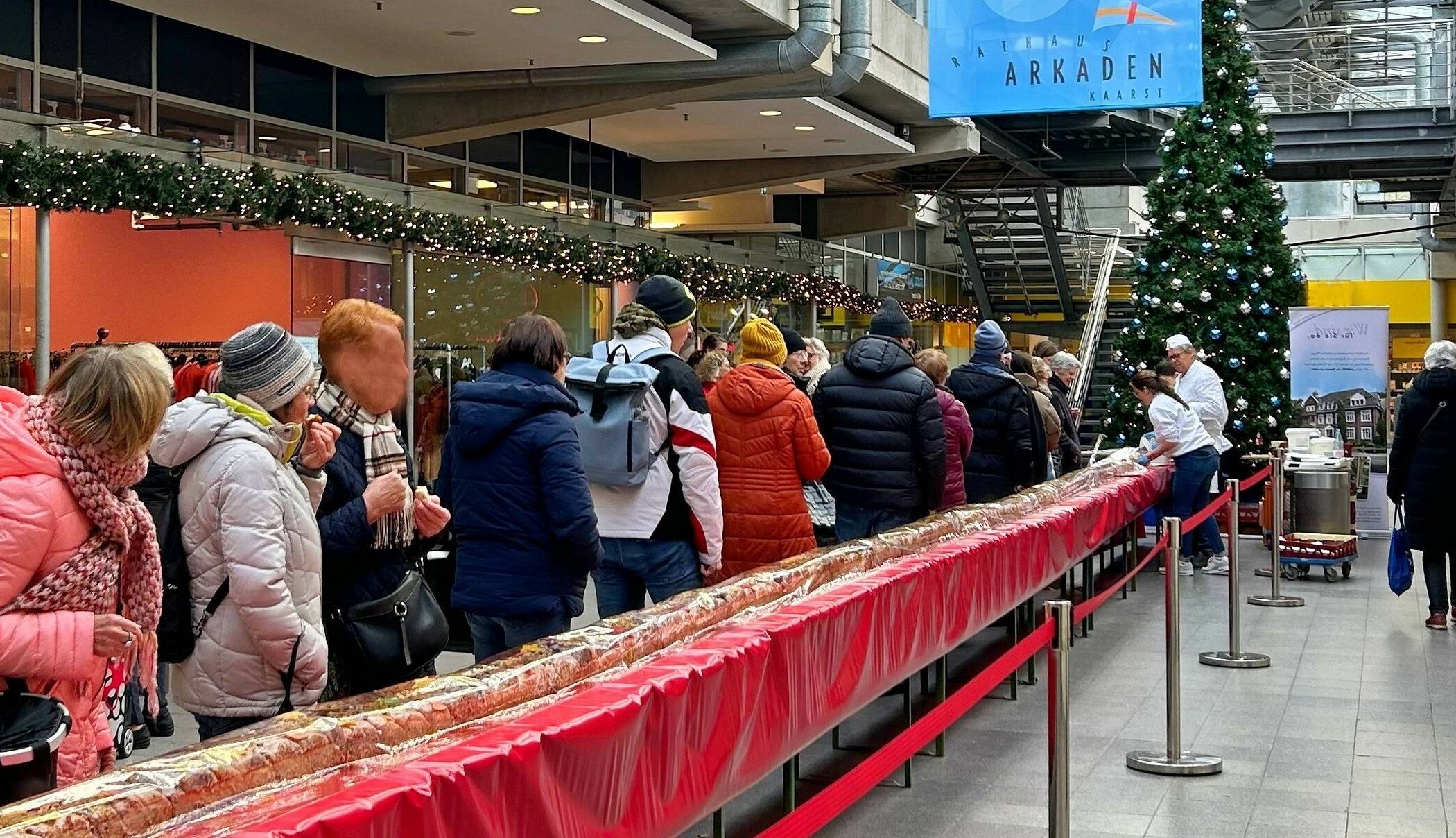 Es werden dazu rund 120 Kilogramm Hefeteig, 50 Kilo Butter, 48 Kilo Marzipan, 30 Kilo Nüsse und 30 Liter Milch verarbeitet. Mit Unterstützung der Werbegemeinschaft Rathaus-Arkaden wird diese Leckerei Stück für Stück für je 1 Euro verkauft. Der Erlös kommt wie schon in den Jahren zuvor je zur Hälfte dem Marienheim Hospiz und der Senioren Initiative Kaarst zugute.