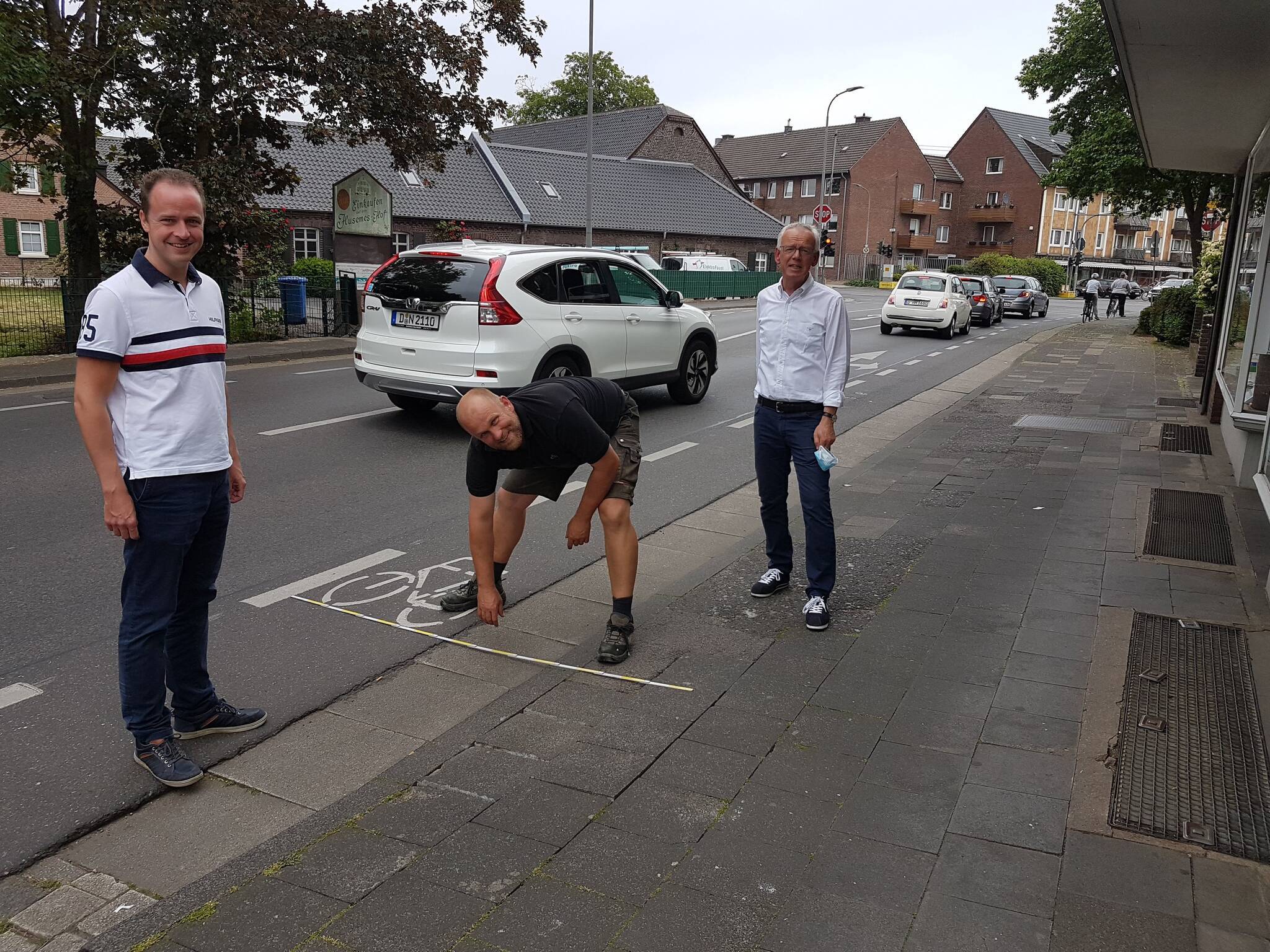 Ortstermin: Der CDU-Bürgermeisterkandidat Lars Christoph und Ingo Kotzian, für die CDU im Stadtentwicklungs-, Planungs- und Verkehrsausschuss, rückten mit Zollstock an, um nach Lösungen zu suchen. Nach Gesprächen mit Kunden und Geschäftsleuten formulierten sie einen Antrag, demnach die Verwaltung beauftragt werden solle, eine Umgestaltung der Verkehrssituation vor dem Gebäude Friedensstraße 4 (Apotheke) sowie dem Gebäude Neusser Straße 3 (Kiosk) dergestalt vorzunehmen, dass hier jeweils zwei bis drei Kurzzeitparkplätze eingerichtet werden könnten. Dabei sei anzustreben, neben dem Fußgängerweg und den Kurzzeitstellplätzen auch den Schutzstreifen auf der Fahrbahn weiterhin zu erhalten. Der Antrag soll im Verkehrsausschuss am 24. Juni behandelt werden.