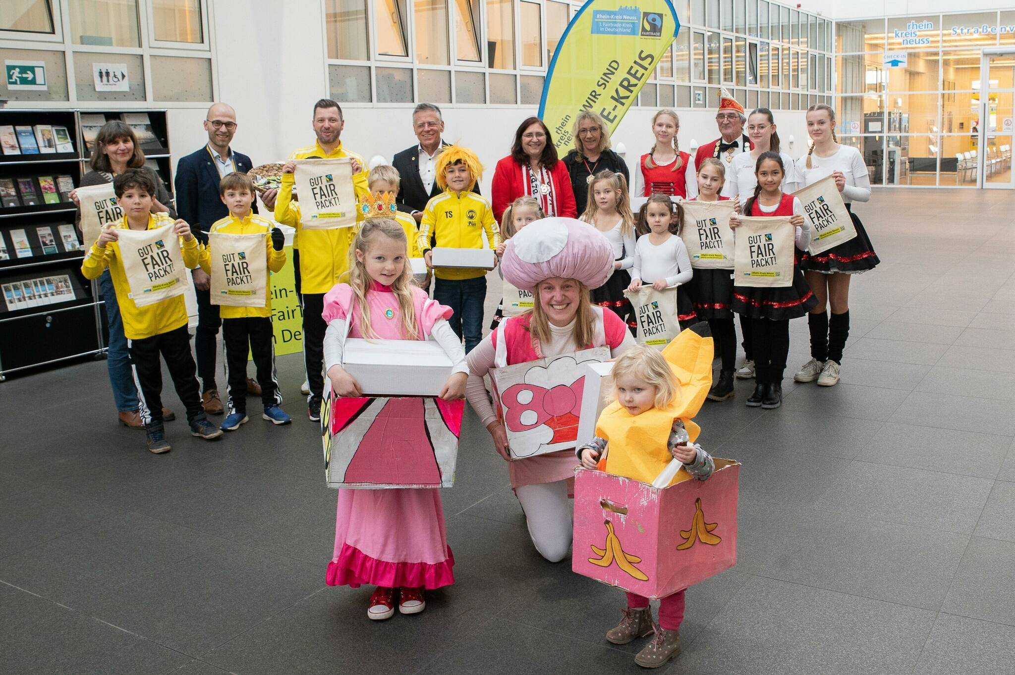 Beim Empfang im Kreishaus Neuss freute sich Landrat Hans-Jürgen Petrauschke mit den jecken Gästen: „Mit dieser Aktion unterstützen wir als erster Fairtrade-Kreis Deutschlands gerne die Karnevalisten im Kreis, damit sie einen Teil des herkömmlichen Wurfmaterials durch Faire Kamelle ersetzen können.“