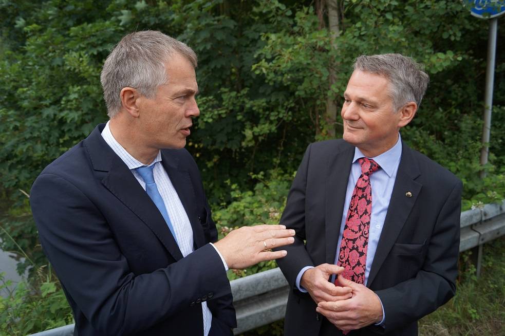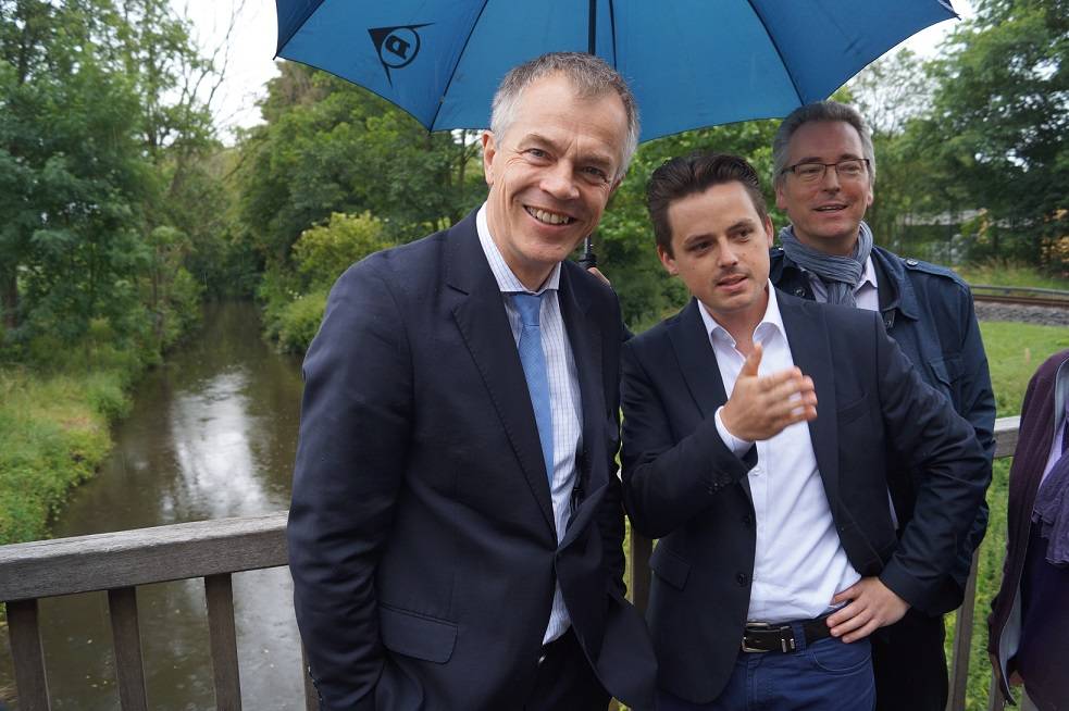 Landratskandidat Hans-Christian Markert und Bürgermeisterkandidat Christian Gaumitz machten gemeinsam mit Minister Remmel und Mitgliedern des Fünfer-Bündnisses an zwei Stellen Halt. Dort, wo der Jüchener Bach in den Nordkanal fließt, ist Landschaftsschutzgebiet. An der Erftstraße hingegen fügt sich das Gewässer ins städtische Bild ein. Remmel machte gleich zu Anfang deutlich, dass noch nichts entschieden sei. "Der Nordkanal ist ein mehr oder weniger stehendes, Künstliches Gewässer. Das Land muss jetzt untersuchen, ob und in welcher Weise der Nordkanal ökologisch wirken kann." Eine Potenzialstudie soll Antworten bringen. Dann soll auch die Frage geklärt werden, ob eine Entschlammung notwendig ist und welche technischen Maßnahmen dann eingeleitet werden müssten, um eine weitere Verschlammung zu verhindern.