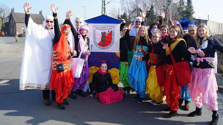 Die Zuschauer am Straßenrand genossen den typischen Kaarster Karneval — herzlich, humorvoll und immer gut gelaunt! Wie zum Beispiel "Scheich Hubert und sein Harem" (Grenadierzug "Die Braven" mit dem Büttgener Schützenkönig Hubert Kallen mit Ministerpaaren und Hofdamen) oder der Jägerzug "Selde Blömkes" mit einem Aprés-Ski-Wagen als Kontrast zum Wüsten-Motto.