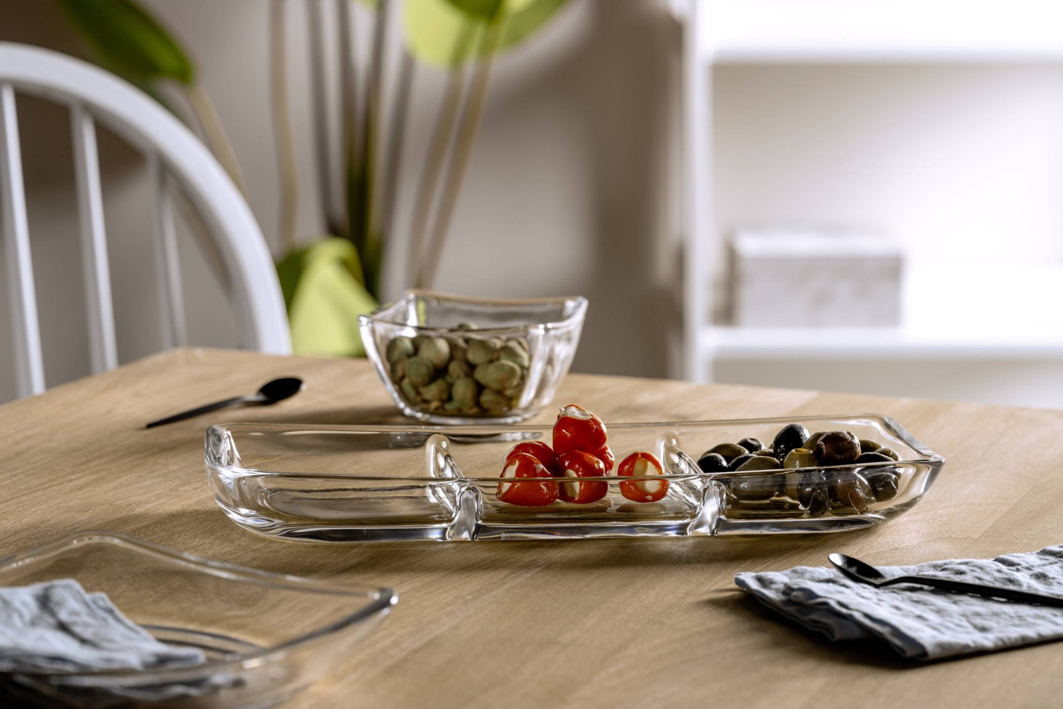 Ein ständiger Begleiter des Aperitifs sollte Wasser sein. Außerdem werden Häppchen und Snacks dazu gereicht. Meist werden verschiedene Kleinigkeiten in Schalen und Schälchen bereitgestellt: Oliven, Nüsse, Salzgebäck, Schinken oder Salami, mariniertes oder rohes Gemüse mit Dipps und Brot. Was für die Italiener die Antipasti, sind für die Spanier Tapas, für die Griechen Mezze. Vieles funktioniert als Fingerfood. Aber auch wenn Teller und Besteck nötig sind, wird der Tisch selten förmlich eingedeckt. Jeder nimmt, was er braucht, und greift einfach zu.