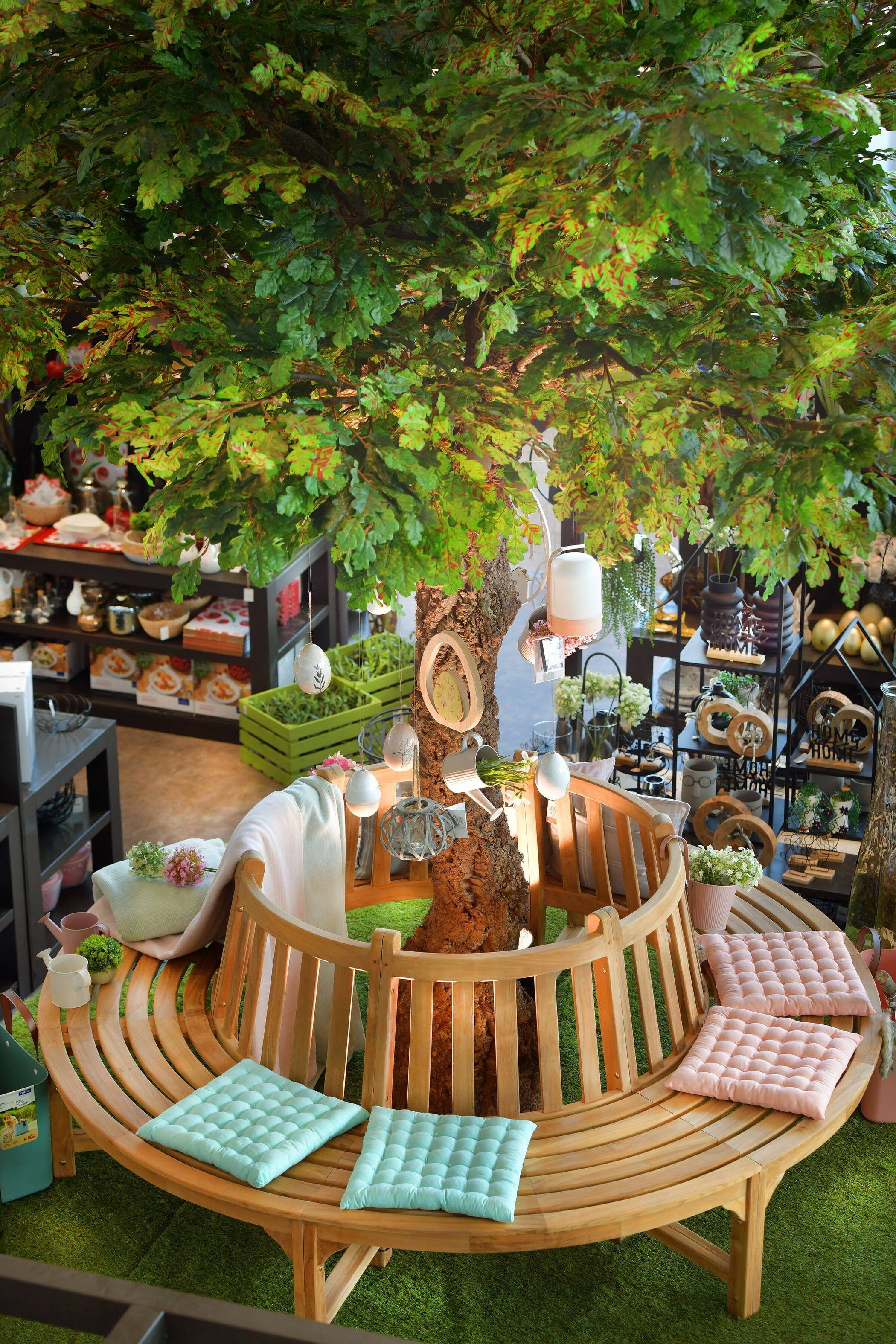 Outdoorteppiche und Grillmatten in vielen Farben gehören genauso zum Angebot wie Tischwäsche, die wertig ist und den besonderen Anforderungen unter freiem Himmel genügt – Regenschauer inklusive. In der großen Ausstellung gibt es auch Porzellan und Trinkgläser, die besonders gut zum Speisen draußen geeignet sind. „Wenn Freunde zu Besuch sind, will man bei schönem Wetter nicht zum Essen wieder rein müssen“, sagt Christina Keller. Dafür, dass man abends möglichst lange im Freien bleiben kann, braucht es manchmal eine leichte Decke – und das passende Licht. Auch das gibt es im Frühlingsmarkt. „LED-Leuchten mit Akku sorgen für die richtige Stimmung an den Sommerabenden“, sagt die Schaffrath-Einrichtungsexpertin. Für Ambiente kann auch eine der kleinen Brunnen sorgen – oder zum Beispiel auf Balkonen in den Innenstädten Zwitscherkästen mit täuschend echten Vogelstimmen.