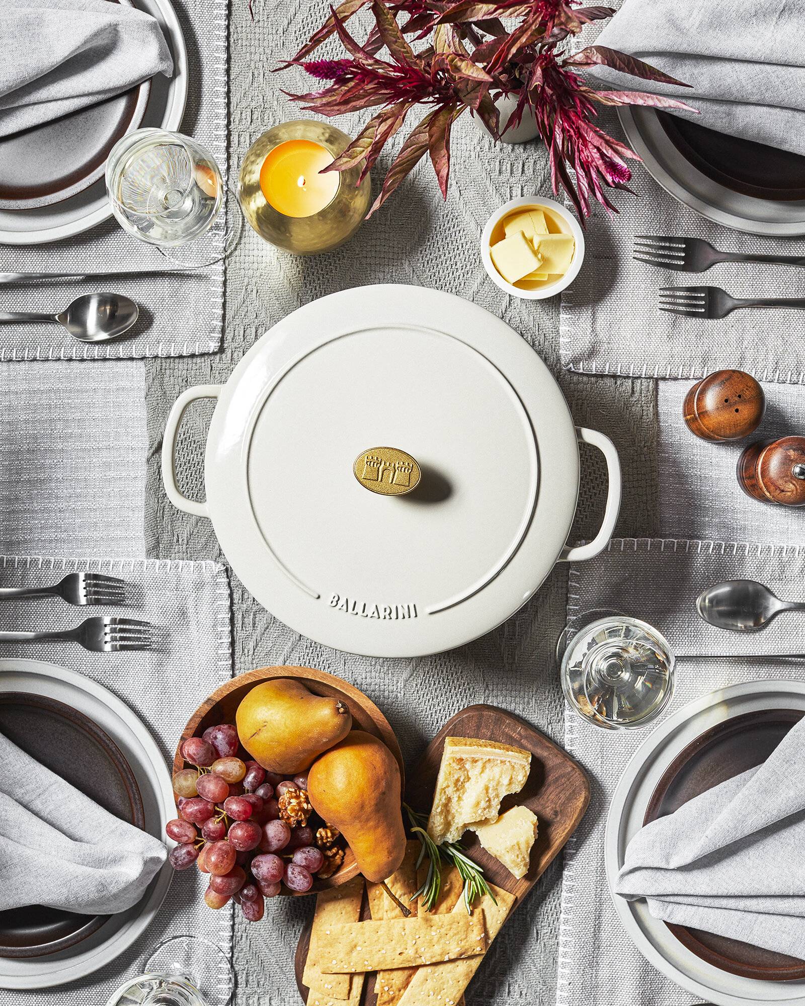Mit der Serie „Bellamonte“ will das 1889 gegründete Familienunternehmen Ballarini Liebhaber der Cucina Italiana für die traditionelle norditalienische Kochmethode des „Paiolo di ghisa“ im gusseisernen Topf begeistern. Das Design stammt von den Mailänder Stardesignern Matteo Thun und Antonio Rodriguez. Der Deckel ist mit der sogenannten „Drop Structure“ ausgestattet, wodurch die Feuchtigkeit gleichmäßig im Bräter verteilt wird. Dies dient der zarten Konsistenz der Speisen.