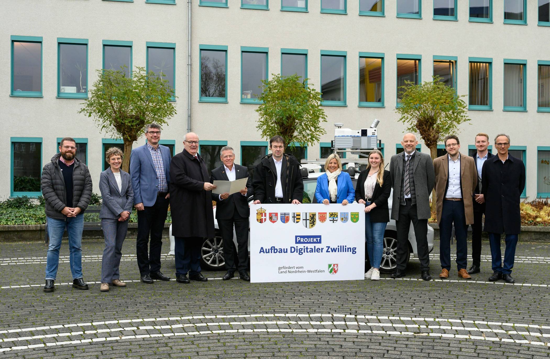 Landrat Hans-Jürgen Petrauschke dankte der zuständigen Ministerin Ina Scharrenbach und der Bezirksregierung Düsseldorf, die beim Termin durch Carsten Kießling und Thomas Hermans vertreten war, für die Unterstützung bei diesem Projekt und für die höchstmögliche Landesförderung: „Geodaten werden bereits seit Jahrzehnten in allen Katasterämtern erhoben. Doch erst mit ihrer systematischen digitalen Zusammenführung und Erweiterung werden sie zugänglich für eine Vielzahl von Smart-City-Lösungen und kommunalen Akteuren.“