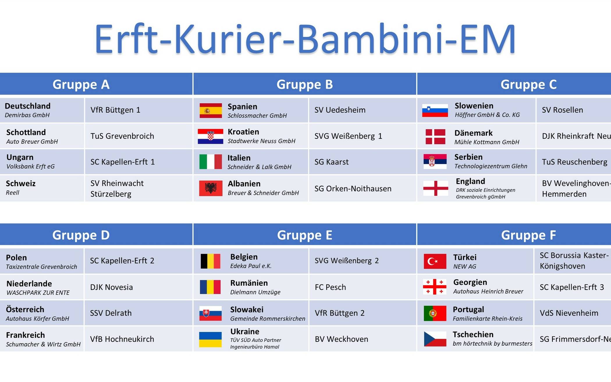 Da zeigt die Erfahrung: Am Ende der Veranstaltung auf der Südanlage werden ganz andere Sieger geehrt als auf dem offiziellen Rasen der Nationen ... Dennoch darf natürlich diskutiert und gerätselt werden, welche Gruppe der „Erft-Kurier-Bambini-EM“ die schwerste ist, wo sich die Favoriten verstecken und vor wem man sich besonders in Acht nehmen muss.