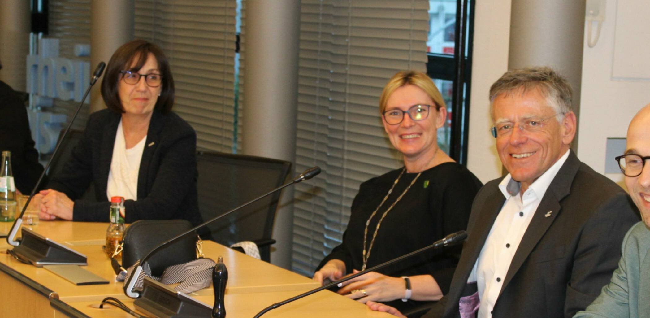 Gute Stimmung auch am Podium: Tanja Schynke von der „Volksbank Erft“ war bei allen bisherigen Turnieren dabei. Annemarie Schmidt vertrat den Hauptsponsor NEW, Bianca Mischtal als stellvertretende Bürgermeisterin die Gemeinde Rommerskirchen. Rechts Landrat Hans-Jürgen Petrauschke und Benjamin Josephs (Kreis-Sprecher und TZG-Geschäftsführer).