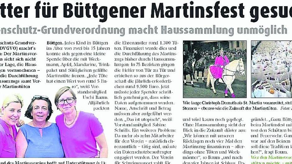 Die Sammeldosen-Methode hat einige Vorteile: Die Sammler müssen die Daten der Spender nicht aufnehmen und der Martinsverein kann auf die Beschäftigung eines Datenschutzbeauftragten verzichten, der alljährlich Geld geschluckt hätte, das der Verein nicht hätte aufbringen können. So aber sind die Vorstandsmitglieder des Martinsvereins Gabi Kammann-Götzen, Anja Finken, Sabine Schrills und Uschi Baum zuversichtlich, dass das Martinsfest gerettet ist. Dafür muss allerdings weiter kräftig gespendet werden. „Mal sehen, ob wir mit den Dosen genau so viel Geld sammeln wie mit unserer bisherigen Methode“, so Kassiererin Gabi Kammann-Götzen. Und Baum ergänzt: „Wir wollen, dass auch weiterhin jedes Kind im Alter von zwei bis 15 Jahren – egal welchen Standes – in Büttgen eine Martinstüte bekommt; das macht unser Martinsfest aus.“ Ein Brauchtum, das den gesamten Ortsteil bewegt, scheint gerettet.