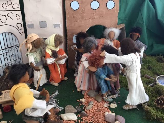 Egli-Figuren sind biblische Erzählfiguren, mit denen die Pfarrerin Geschichten aus der Bibel anschaulich und vor allem kindgerecht darstellt. Die Figuren hatte sie vor Jahren mit Gemeindemitgliedern im Rahmen eines Workshops hergestellt, jetzt sind sie im Dauereinsatz. Scholl drapiert allwöchentlich die Szenen mit den Figuren und Häusern. Da wird auch schon mal ein blaues Handtuch zum wogenden Meer.