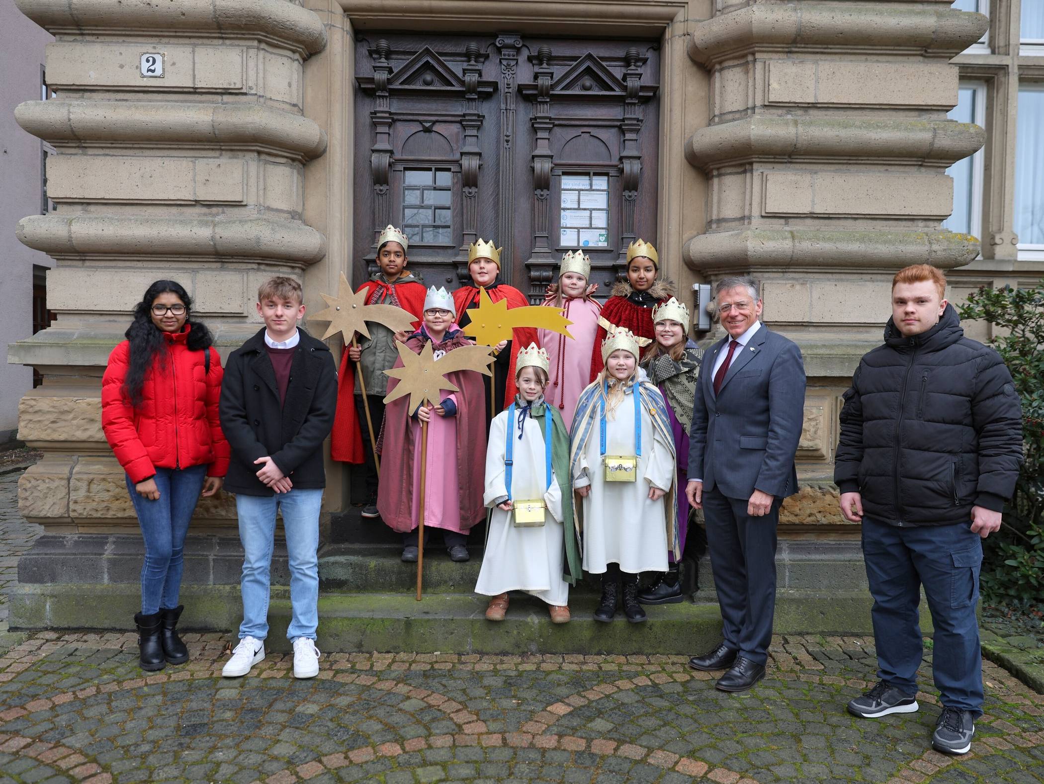 Petrauschke dankte allen Sternsingern, die in diesen Tagen im Rhein-Kreis Neuss unterwegs sind: „Ihr zeigt und lebt Solidarität mit den Kindern in Not in aller Welt und seid daher Vorbild für viele andere in unserer Gesellschaft.“ An der Eingangstür des Ständehauses brachten die Sternsinger den traditionellen Segensgruß „Christus Mansionem Benedicat“ (Christus segne dieses Haus) an, der als Kürzel C + M + B oft auch als Abkürzung der Heiligen Drei Könige Caspar, Melchior und Balthasar verstanden wird.