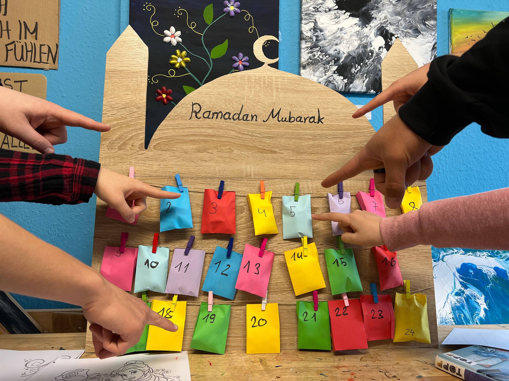 Das Team vom InKult hatte sich gemeinsam mit Jugendlichen aus der Einrichtung überlegt, dass man kleine Überraschungen vorbereiten könnte, die dann täglich an alle verteilt wurden. Wenn neue Kinder und Jugendliche zum Treffen kamen, wurden diese auch mit integriert. Hierfür wurde ein eigener Kalender aus Holz gebastelt.