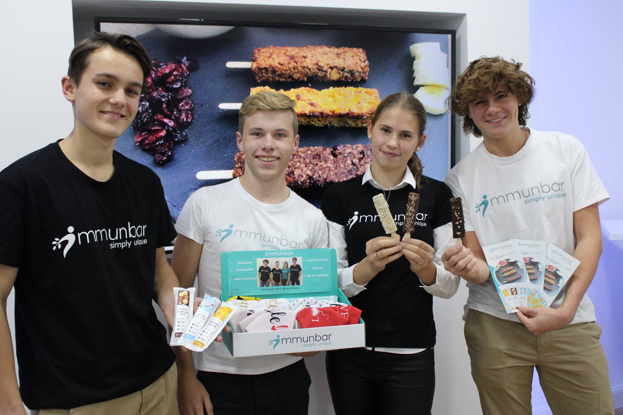 Hier wird er auf seine „Kollegen“ des Neusser Schüler-Projektes immunbar treffen. Sie sind in der Kategorie „Consumer Products“ unter den Top Drei gelandet. Das engagierte Quartett besteht aus Leon Gilges, Daniel Heidemann, Christian Spinnrath (alle 16 Jahre alt, Schüler des Quirinus-Gymnasiums) und Alina Schrainer (ebenfalls 16, Schülerin des Gymnasiums Marienberg). Sie wollen die Jury in Berlin mit verschiedenen Fruchtriegel-Varianten überzeugen. Der Clou: Der Riegel am Stiel kann genossen werden, ohne sich die Finger „vollzukleckern“. „Alles natürlich öko, vegan und handgemacht“, berichtet Leon über Produktionstage mit der ganzen Familie in der Kochschule by Uwe Hemm in Kerpen. „Da hat die Oma stundenlang Orangenschalen geraspelt“, schmunzelt Alina.