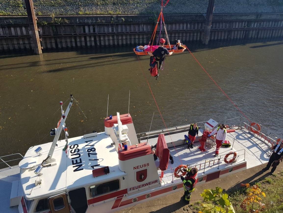 Durch die gute Zusammenarbeit zwischen Feuerwehr und Rettungsdienst konnte die Patientin schnell und schonend in ein Krankenhaus gebracht werden. Um dies zu ermöglichen rückten die hauptamtlichen Kräfte der Feuerwehr Neuss zur Einsatzstelle aus. Unter anderem waren das Feuerlöschboot Neuss und eine Drehleiter der Feuerwehr im Einsatz, um die verletzte Frau vom Schiff an Land zu transportieren.
