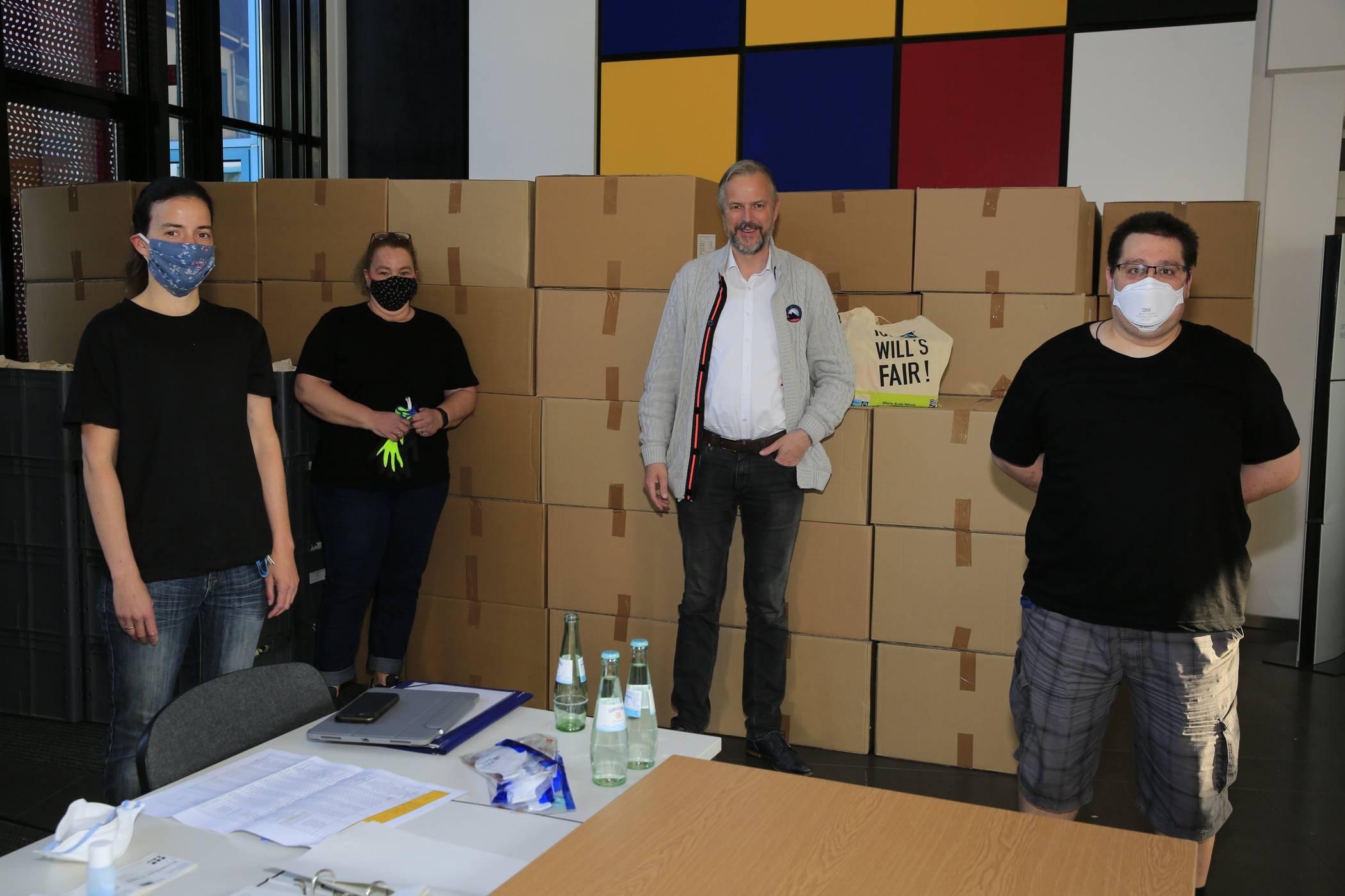 Kreisdirektor und Corona-Krisenstabsleiter Dirk Brügge (3. v.l.) mit Yvonne Janssen, Heike Schwanz und Achim Kuska (v.l.) vom Beschaffungsteam der Kreisverwaltung bei der Übernahme der aktuellen Sonderzuteilung an Schutzmasken im Kreishaus Grevenbroich.