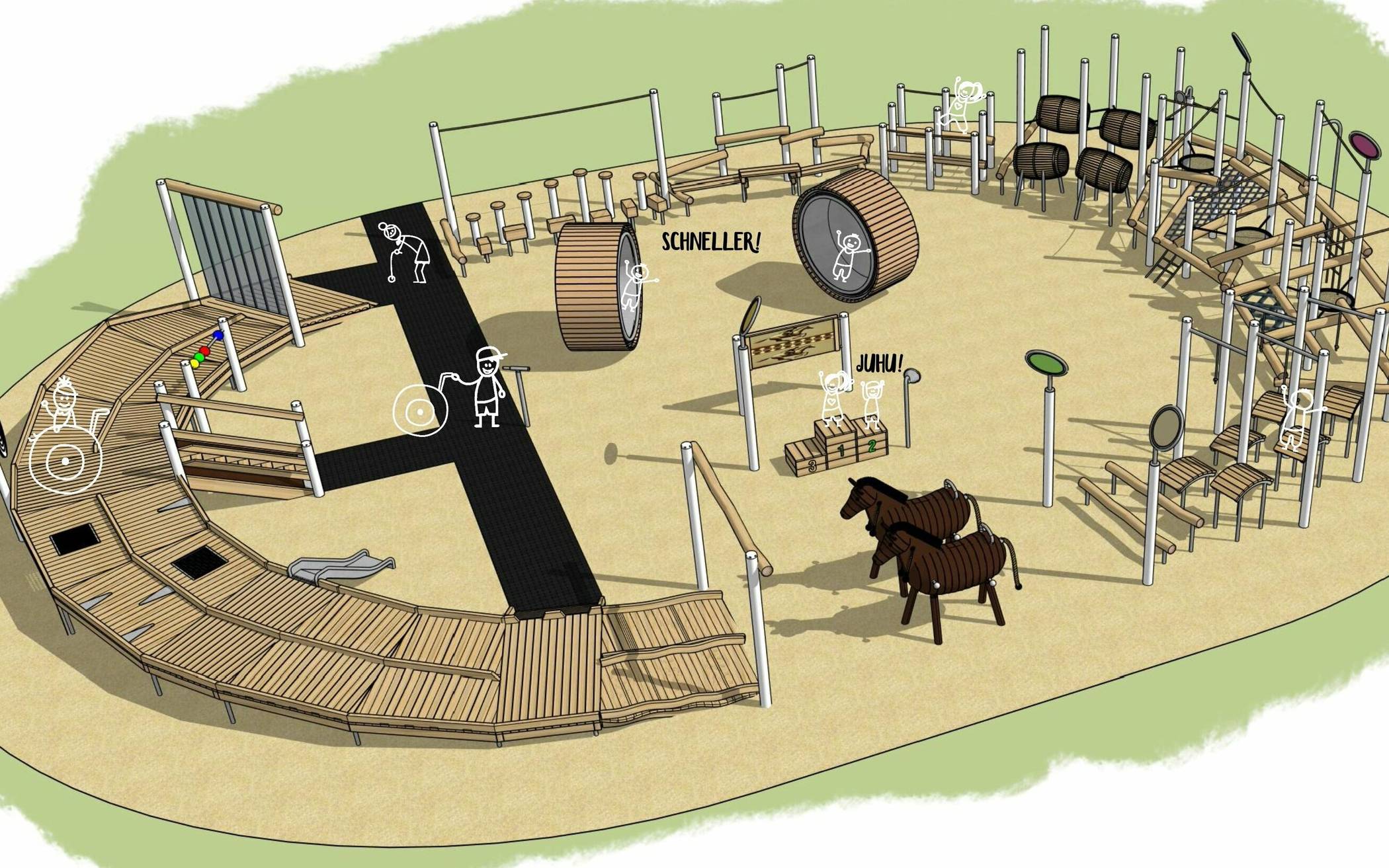 Nachdem der Bürgerpark in Teilbereiche gegliedert sein wird, orientieren sich die Themen der Spielplätze an den Teilbereichen, in denen sie gebaut werden: im Sporthain, dem Naturhain und dem Hammfeldhof. „Der erste Ort ist nah am Eingang, gleich neben dem Sportangebot für Erwachsene. Auf dem Rennbahn-Spielplatz wird es eine Menge Gelegenheiten zur Bewegung geben. Balancierelemente, eine Wirrwarr-Strecke, eine Lianenbahn, Lauftrommeln, eine inklusive Steganlage und vieles mehr warten darauf, von großen und kleinen Kindern entdeckt zu werden. Darüber hinaus wird die Historie der ehemaligen Pferderennbahn spielerisch mithilfe von dynamischen Spielgeräten aufgegriffen.