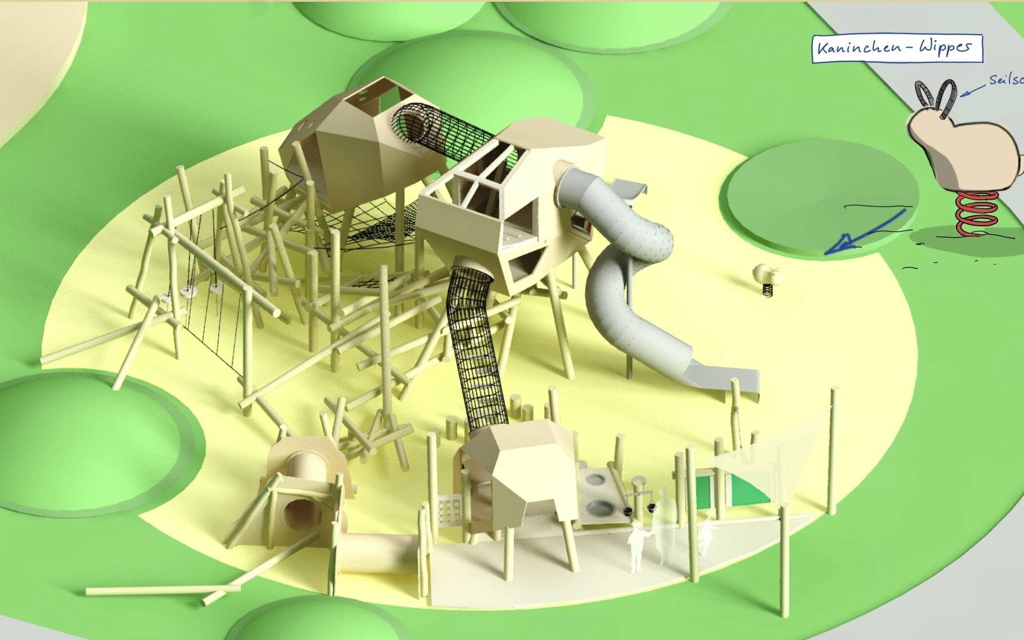 Im Naturhain wird es um das Naturerlebnis gehen. Inspiriert von den zahlreichen auf dem Gelände lebenden Kaninchen wird eine über fünf Meter hohe Spielskulptur errichtet, die den Kindern das Gefühl geben wird, einen Kaninchenbau betreten zu haben. Mehrere durch Tunnel miteinander verbundene Kaninchenhöhlen, natürliche Materialien und eine reduzierte, naturnahe Farbgebung, eine geschlossene, gewundene Rutsche, Kaninchen-Wipptiere und mehr laden zum natürlichen Spiel ein. Schnatmann freut sich: „Auch im Innenbau wird es Spielwert durch Geräte an Wänden, Boden und Decke geben.“ Seile und ein Holzgerüst sorgen für bespielbares „Wurzelwerk“ rund um den Kaninchenbau.