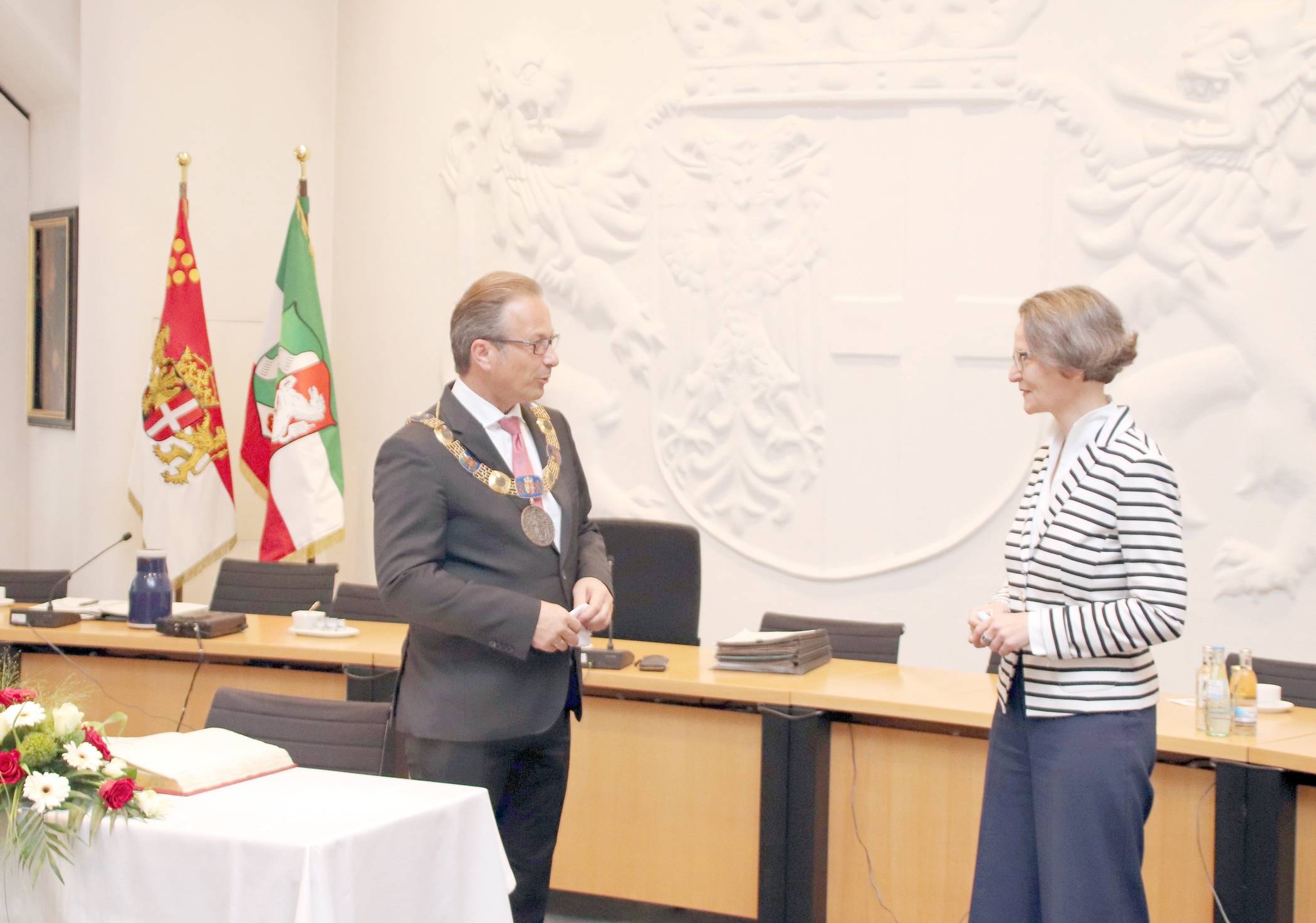 In Anwesenheit des Gremiums trug sich Ministerin Scharrenberg außerdem in das Goldene Buch der Stadt Neuss ein und nutzte die Gelegenheit, um mit der Verwaltungsspitze das Thema der Sicherung von Mieterschutz und Wohnraumförderung zu erörtern. Die Anfang Juli in Kraft getretene „Mieterschutz-Verordnung“, nach der die Stadt Neuss nicht mehr wie bisher in die Gebietskulisse der Kommunen mit angespanntem Wohnungsmarkt aufgenommen werden soll, ließ befürchten, dass auch im Bereich der sozialen Wohnraumförderung eine neue Einordnung erfolgt. Die daraus resultierende Reduzierung der Förderpauschalen pro Quadratmeter Wohnraum bleibe davon jedoch unberührt, erläuterte Scharrenbach in der Sitzung.